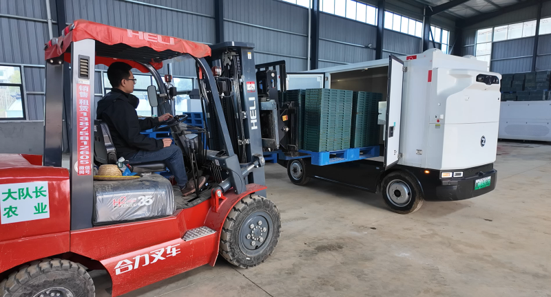 工作人员驾驶叉车往无人配送车运送育秧盘 张益平 摄