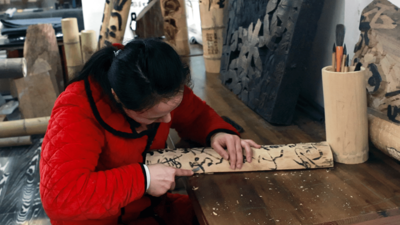 “用的竹子,全部是桃江本土的原生态楠竹。作为‘楠竹之乡’,我们就应该用最地道的材料,来讲好桃江的故事。所以我们提出了‘竹上丹青’这个创意——以刀代笔,在竹子上写书法。大家看到的这些作品,不管是美人窝的文化、风土人情,还是名胜景点,全都是取材于桃江本土。这就是我们的初衷,也是我们会一直坚持做下去的事。”湖南省刻字委员会委员、省书协刻字艺术创作培训基地导师钟健介绍道。