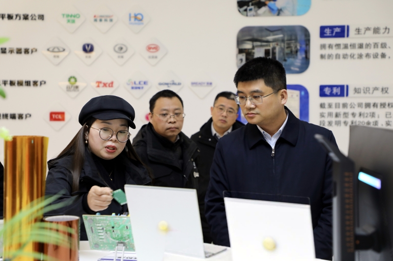 在湖南壹鑫科技有限公司,沈澍参观了产品展示厅和生产车间,深入了解企业技术研发、工艺创新、产品应用等情况。该公司是一家专注于光学显示屏材料、集研发生产于一体的国家高新技术企业。目前,公司第3条生产线顺利量产,第4、5条高端涂布线即将落成,可实现产能翻番、预计产值1.2亿元。他叮嘱企业要持续加大核心技术攻关,不断提升产品竞争力和市场占有率。