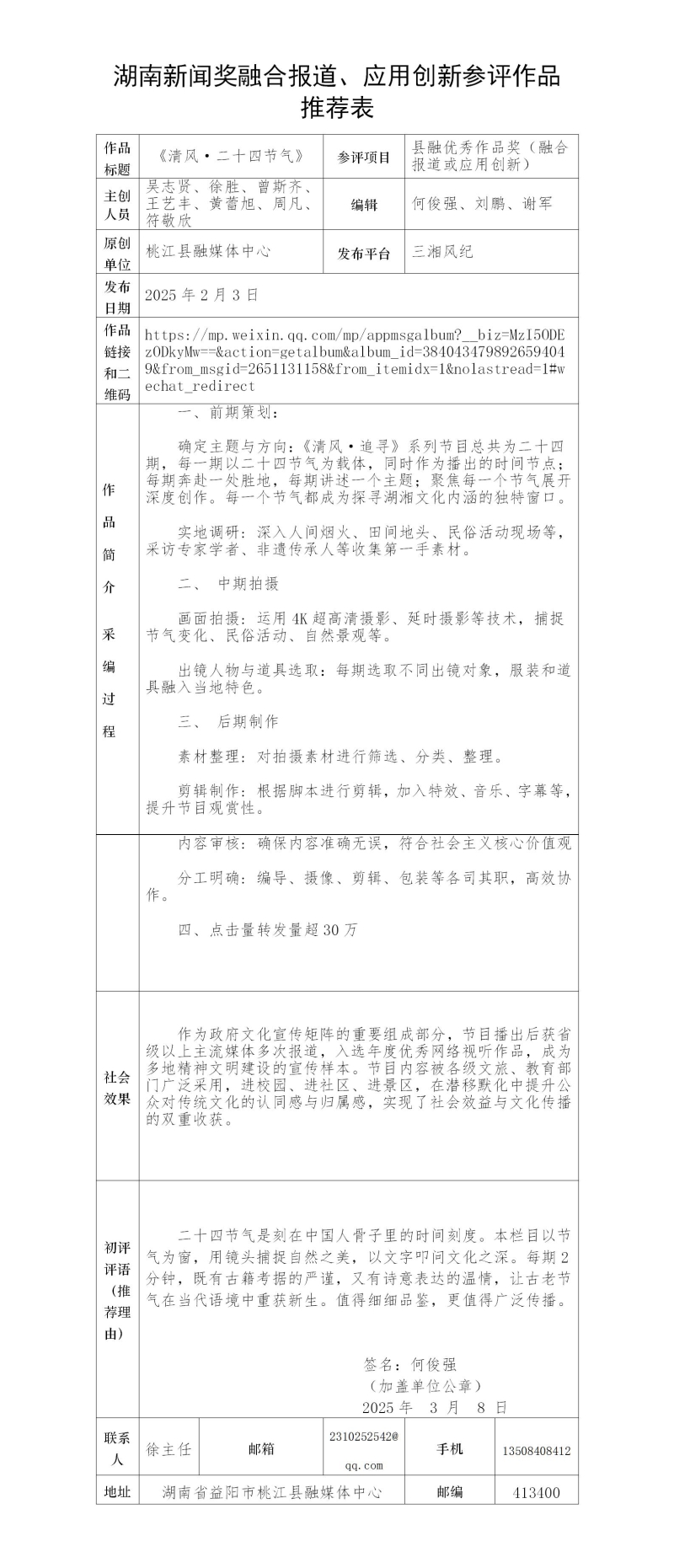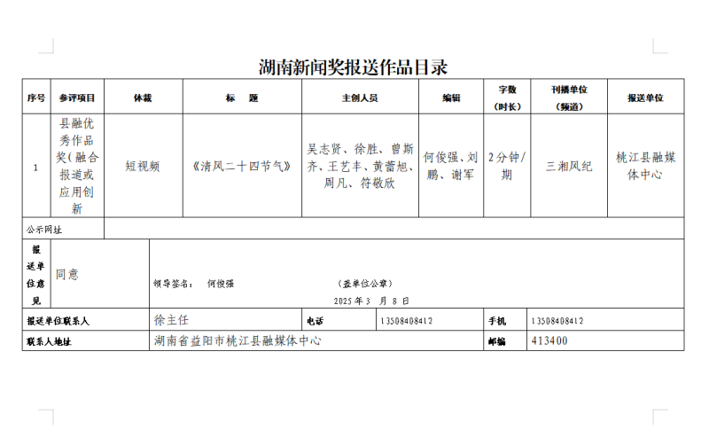 关于桃江县融媒体中心拟参加2025年度“湖南省新闻奖”的评选材料公示通知公告2026-03-10 22:30:49 根据湖南省委宣传部和湖南省新闻工作者协会《关于开展2025年度新闻奖参评作品保送工作的通知》精神,桃江县融媒体中心拟参加2025年度“湖南省新闻奖”的评选,现将评选材料公示如下: