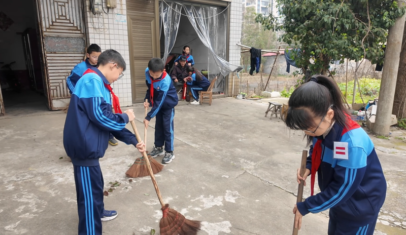 少先队员们为困难党员清扫庭院   莫斌 摄