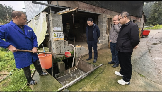 卢建效(左一)展示发酵后的粪水水体状态 胡卫红 摄