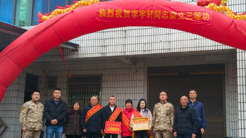 近日,灰山港镇为荣立三等功的现役军人李宇轩家属送上立功喜报与慰问金。