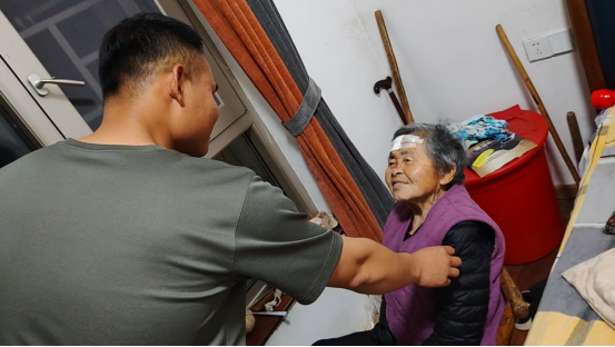 情况紧急,高启龙毫不犹豫踩下油门靠近,停车后便与母亲一同下车。他顾不上田间泥泞,当即脱下鞋袜冲向老人。此时,86岁的杨奶奶额头磕破、鲜血直流,神情十分痛苦。高启龙立刻运用部队所学的急救知识检查老人,确认无骨折后迅速为其止血,并叮嘱母亲及时呼救。