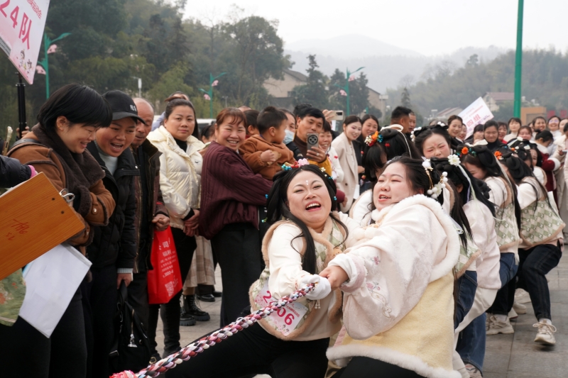 投壶赛场雅致有序,选手们凝神静气、稳握箭矢,精准瞄准、从容投掷,一道道优美弧线凌空而过,每一次入壶都引来阵阵欢呼;蹴鞠场上活力满满,队员们脚步灵动,瞄准得分区精准投射,趣味与技巧兼具;“齐心协力”赛道上,队员们步调一致,喊着整齐口号稳步向前,展现出超强的团队凝聚力。压轴登场的拔河比赛将全场气氛推向最高潮,选手们紧握长绳、重心下沉,绳索来回拉锯、悬念拉满,呐喊声、加油声、欢笑声响彻竹海,场面热烈非凡。整场赛事既比拼技艺,更彰显团结协作、奋勇争先的精神,充分展现了桃江女性昂扬向上、坚韧奋进的良好风貌。