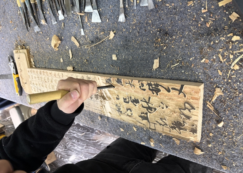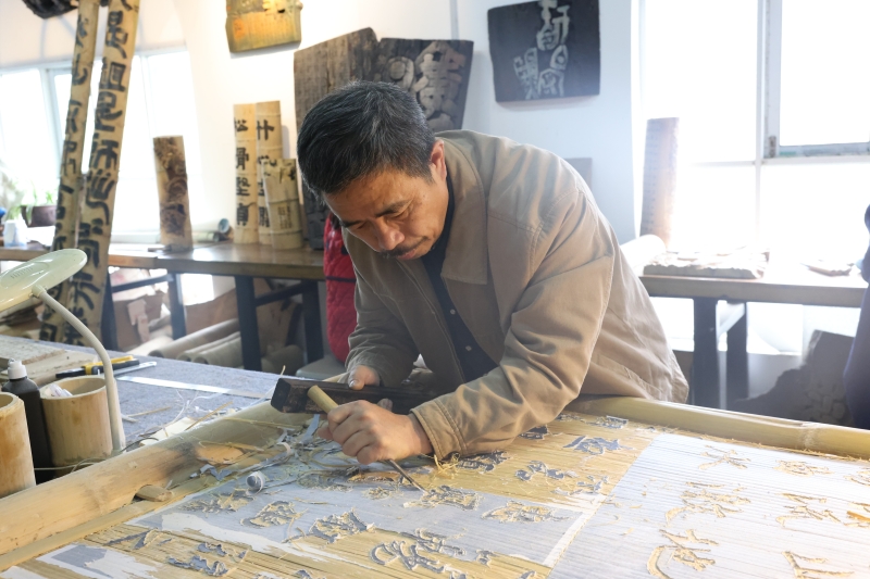 暮春时节,位于桃江天问书院的省书协刻字艺术创作培训基地内,砂轮机低声嗡鸣,空气中弥漫着竹香,间或传来刻刀敲击竹板的清脆声响,竹屑在灯光下飞舞。距离“竹上丹青”刻字精品展开幕不足百日,来自桃江县书法家协会的十余位刻字作者正弓着身子,在竹板上精雕细琢。这一方小小的工坊,既是艺术创作的一线,也是桃江县推进“竹旅文体康”产业融合、弘扬“挺抢”作风的生动缩影。