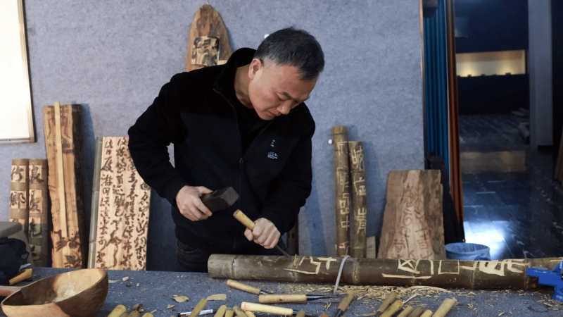在交流区,创作者们则围坐在一起,探讨如何将现代审美融入传统技法。“我就想通过手中的刀,打造出一幅完美的竹刻作品来,让外面人一看见,就知道这是我们桃江的味道。”创作者詹叶飞道出了大家共同的心声。青年作者钟一垓一边打磨刻刀一边说:“现在大家都在抢时间,白天刻字,晚上还要查资料改稿,就想拿出最好的作品。”