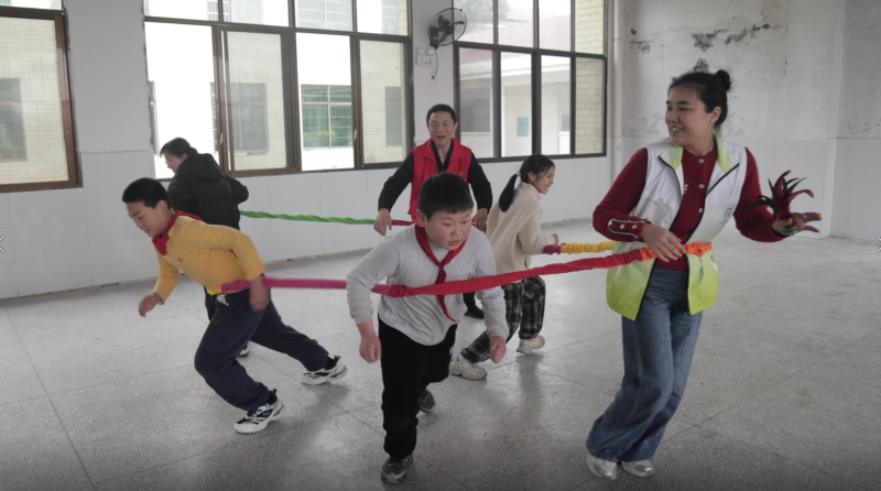 工作人员与孩子们进行互动游戏  罗寒 摄